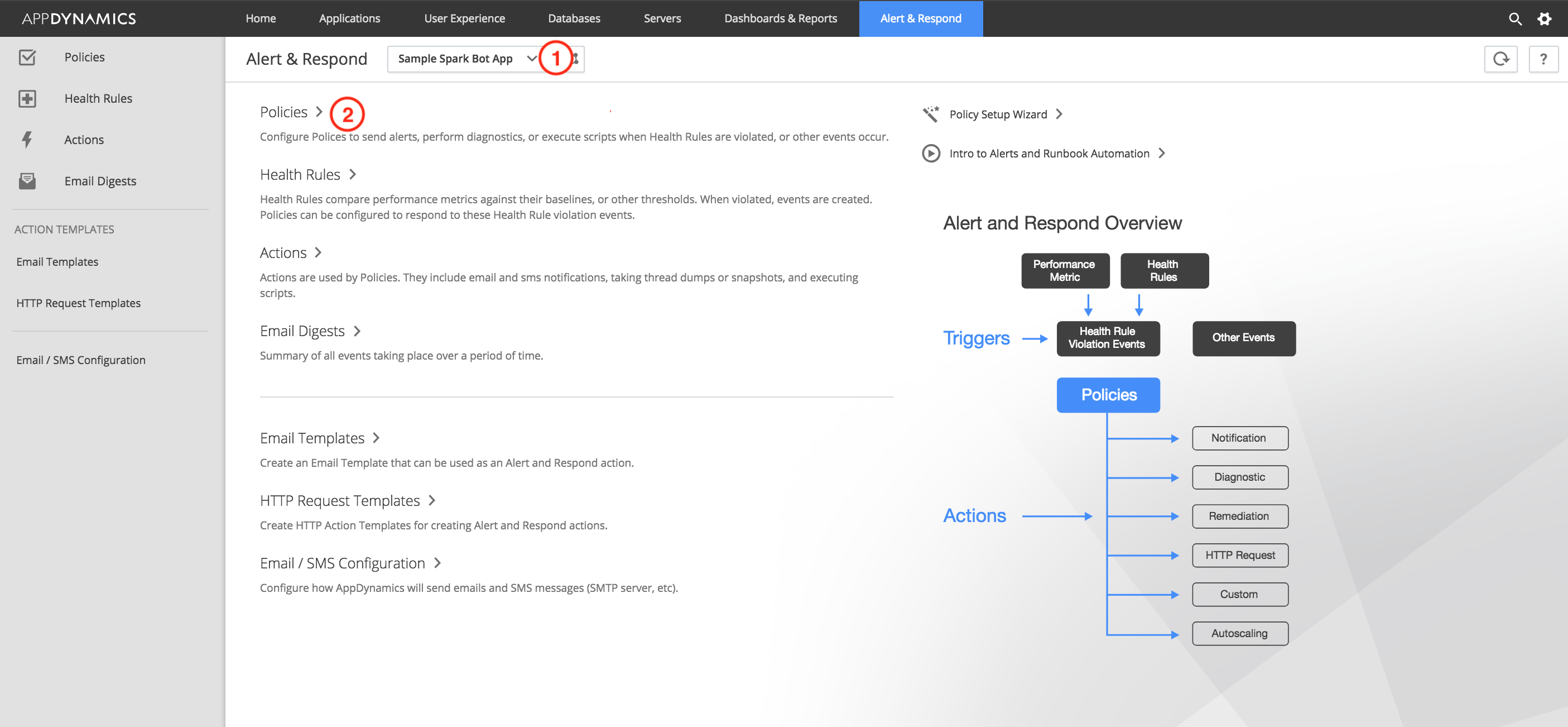 In order for the monitor and alert functionality to work on AppDynamics, you need to create a Policy that defines the criteria that you want to monitor and the action that you want to take. In order to do this, log into your controller and click the “Alert & Respond” Tab. Once you are on the “Alert & Respond” Tab, you will want to choose your application from the drop down menu and then click “Policies”. This will take you to a list where you can edit, delete and create new policies.