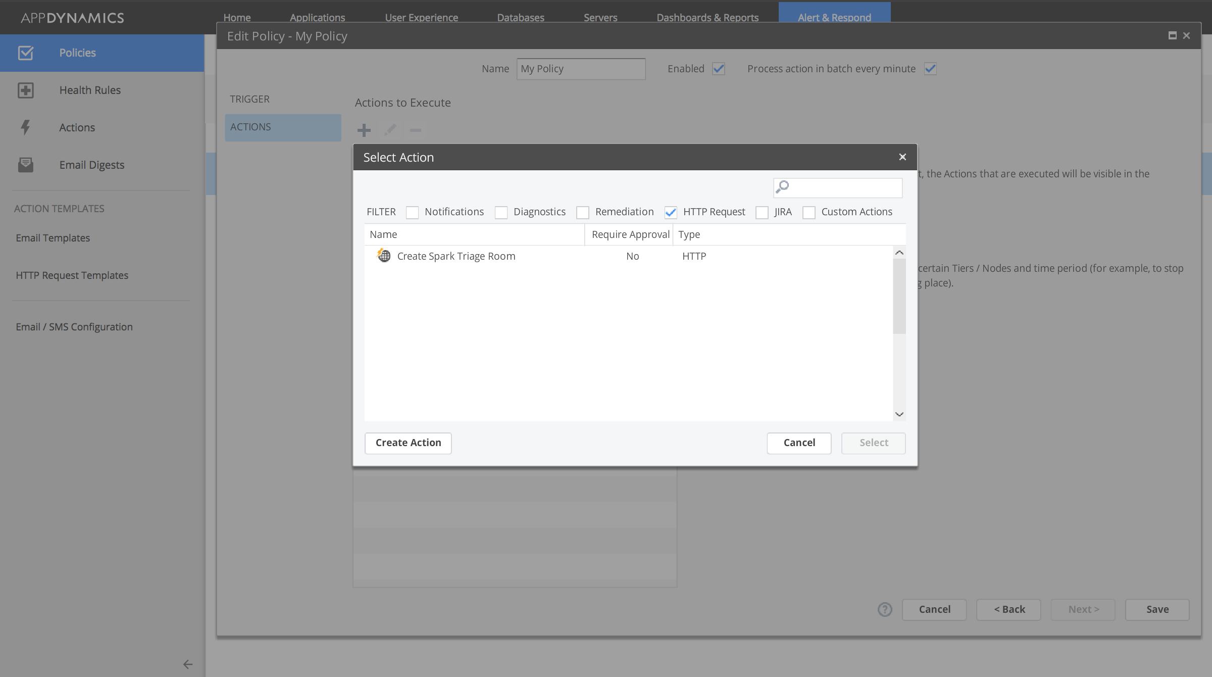 Now that we have created the HTTP Template, we need to go back into the Policy we created and assign an action. So go back, edit your policy, select “Actions” and then add the newly created HTTP Template.