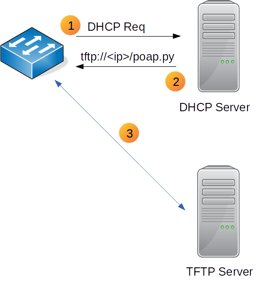 One of the first things a brand new switch on boot does, is make a DHCP request. The DHCP server receives the request and based on the source mac address, assigns the device an IP address. In addition to assigning an IP address to the device, the DHCP server’s response contains the name of a Python(or TCL) script in option 150/66 along with the IP address of a TFTP server to download the script from.