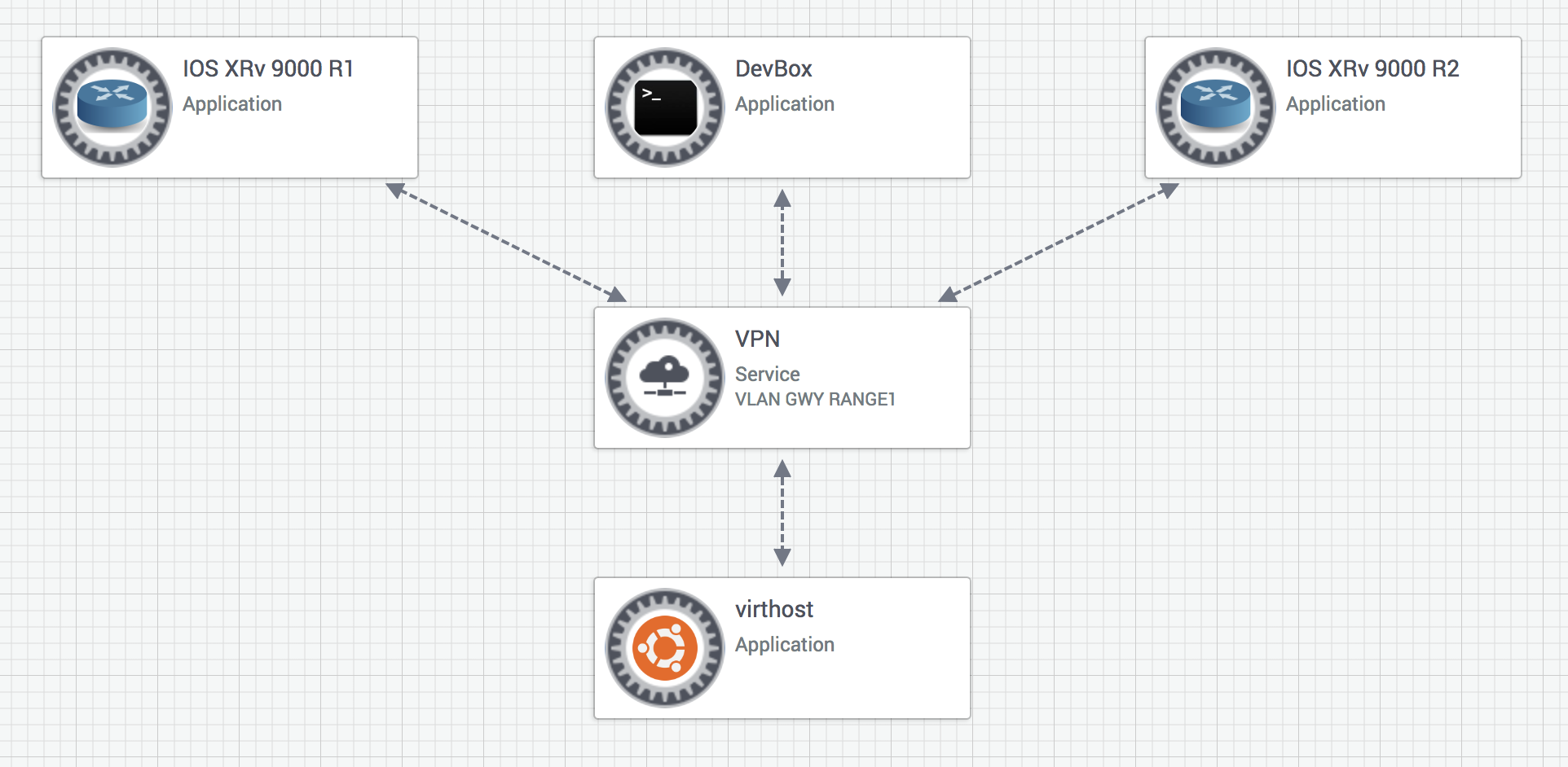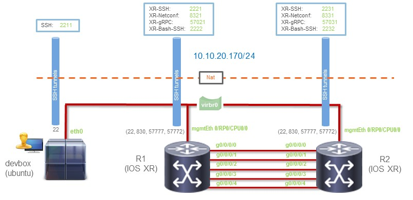 We wanted to build a sandbox that provides the right level of simplicity for users to get started while offering a flexible platform they can build on. The sandbox provides two Cisco IOS XRv 9000 devices (R1 and R2) connected back to back, plus a Linux host that acts as a development box (DevBox). The image version on Sandbox tile is 6.4.1 this is available on both the two IOS-XR nodes. More information on this release can be found here: Release Notes for Cisco IOS XRv 9000 Router, IOS XR Release 6.4.1
