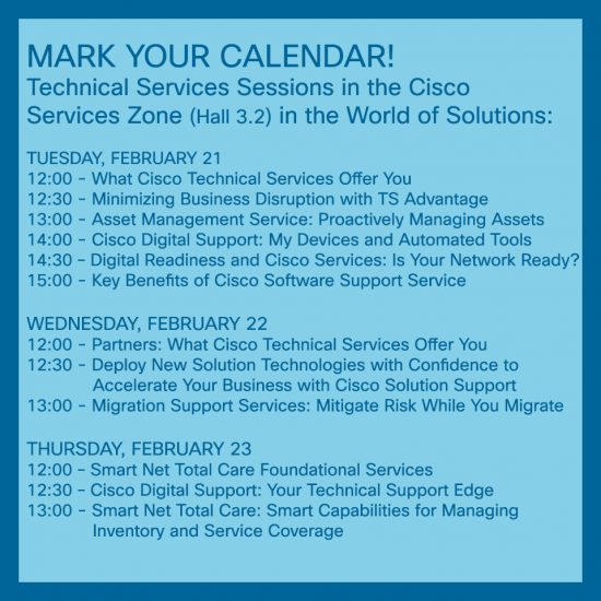 See our services up-close-and-personal in the Cisco Services Zone (Hall 3.2) in the World of Solutions. This is a playground of ideas. Souse this opportunity to talk directly to the architects and IT experts that will deliver interactive Technical Services demos. While you are there, drop by for a Technical Services session in the theatre to get a “deep dive” on selected topics. These bite-size sessions are perfect to explore our services. See the full schedule of Services Theatre sessions.