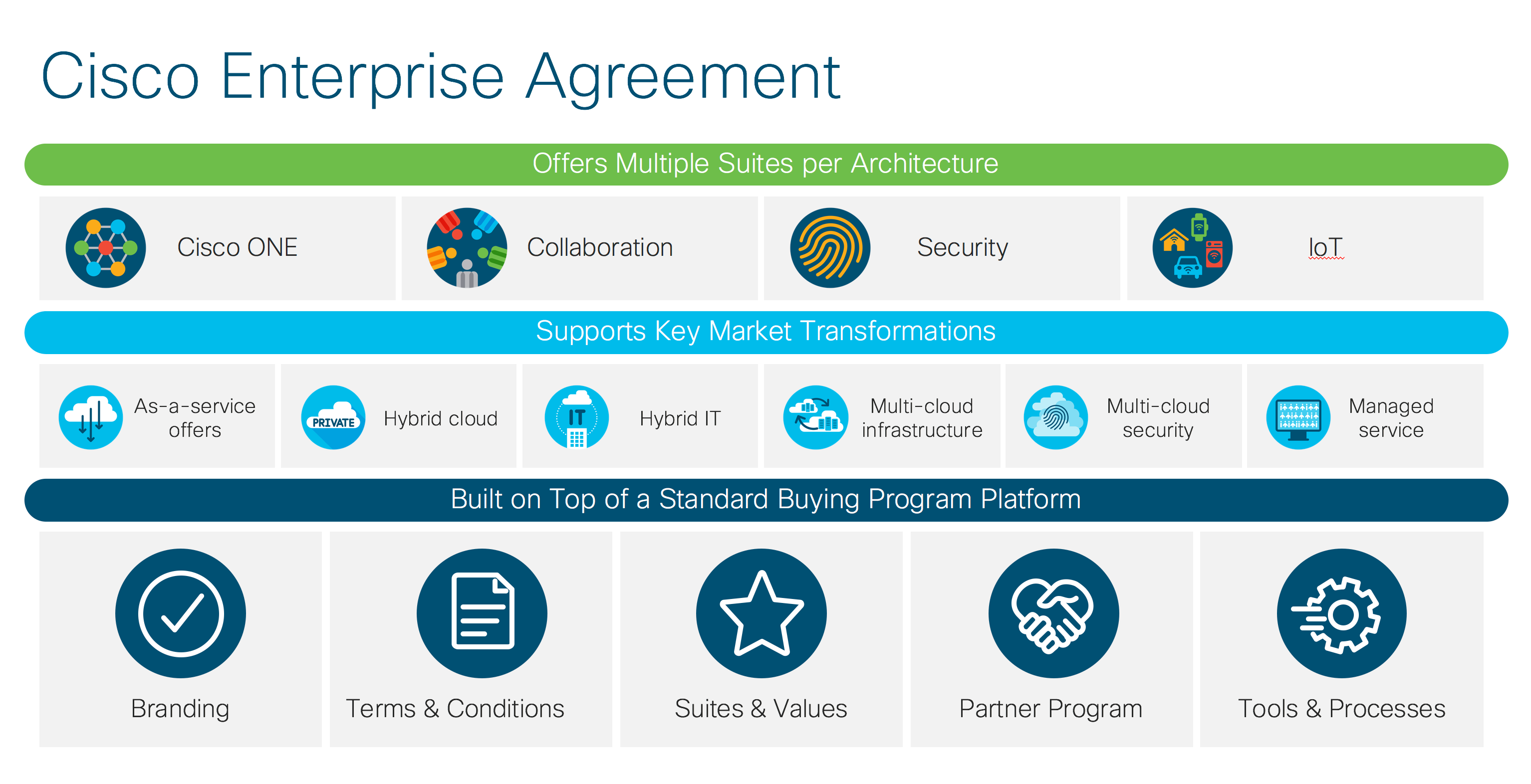 The Cisco EA is a cross-architecture, multiyear agreement that provides organizations enterprise-wide entitlement to suites of products and services. It provides access to any or all of the capabilities in collaboration, infrastructure and security with room for customers to grow later.