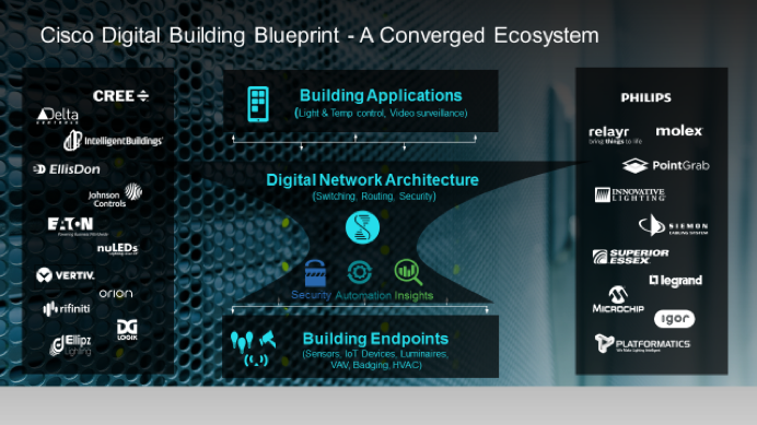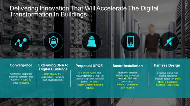 - Extending Cisco’s Digital Network Architecture to Digital Buildings – Automation, security, and analytics brought to digital buildings for IoT devices enabling faster on-boarding, automated provisioning and monitoring, intelligent threat detection and mitigation. For instance lighting ports can only be used for lighting and not to access other areas in the network.