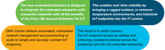 Cisco’s Software-Defined Access is the first intent-based networking solution for the enterprise built on the principles of Cisco’s Digital Network Architecture (DNA). SDA helps make the network more programmable and flexible by monitoring, managing and securing all from a central management platform: the DNA Center (DNAC). The DNAC expands out to embrace IoT with SDA extension for IoT.