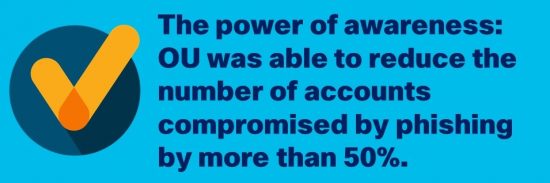 One year ago, OU experienced phishing attacks daily and the average response rate was about 15 percent per attack—with hundreds of accounts compromised each week. One year later, in September 2017, OU experienced fewer attacks, about two dozen, and had just 300 compromised accounts in all—a reduction in compromised accounts of more than 50 percent.