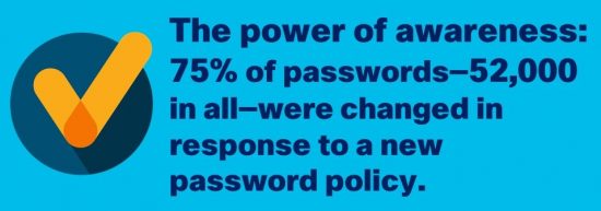 In fall 2016, the university implemented a new password policy that encouraged users to change all passwords and replace them with a 12-character password or passphrase. The results were significant: 75 percent of the approximately 70,000 passwords used—more than 52,000 in all—were changed before the university had to take the more drastic step of locking out accounts until new passwords were set.