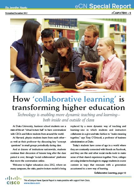 A just published eCampus News special report on collaborative learning details how universities such as Duke, San Jose State University, Case Western, and West Texas A&M are embracing video, flipped learning and social collaboration platforms, like Cisco’s recently announced WebEx Social for Higher Education, to help faculty and students interact “in much richer ways’.