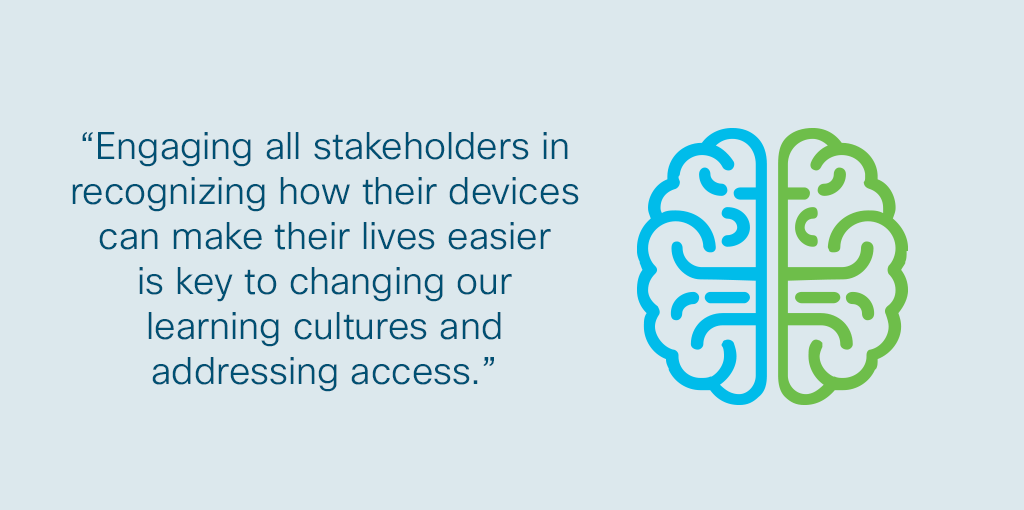All of us have a story of how we have used our devices in powerful ways. Engaging all stakeholders in recognizing how their devices can make their lives easier and ultimately allow them to participate in the global discourse is key to changing our learning cultures and addressing access. The sooner we enable stakeholders to leverage their devices, the sooner they will see this as true for students.