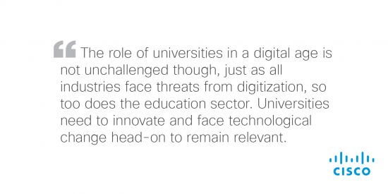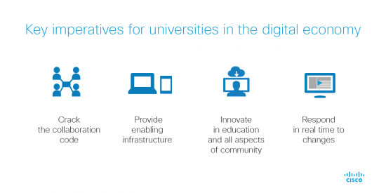 - Universities must shift the paradigm that rather than being standalone institutions, they are active and important participants within a digital ecosystem. This requires a mind-set of collaboration and open partnerships so that universities can help to co-create the future and act as advocates for new theories and technologies as they come to life.