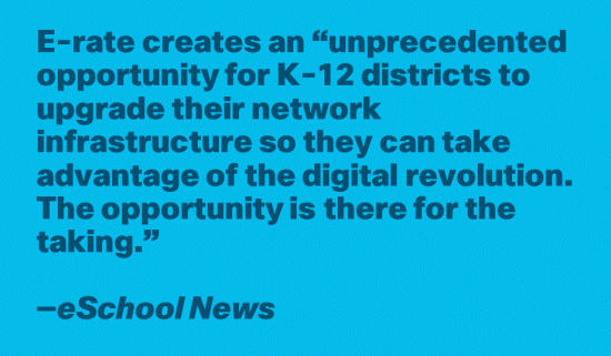 In a new eSchool News special report, Supporting a Digital Transformation in Schools: How to build a network infrastructure that will have you poised for ed-tech success, the experts at eSchool News highlight an important—and often overlooked—fact. E-rate creates an “unprecedented opportunity for K-12 districts to upgrade their network infrastructure so they can take advantage of the digital revolution. The opportunity is there for the taking… [and] the time [to take advantage] is now.”