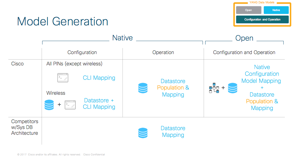 Since we will not rely on any dedicated CLI syntax to push and/or get the device’s configurations/attributes, the API approach is much more preferred  as new features/attributes can be augmented to the modeled tree.