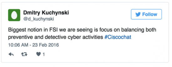 I hope you’ll join me on April 26th when I’ll be hosting my second #CiscoChat and the topic will be optimizing the customer interaction. Please visit our Financial services page and follow us on Twitter @CiscoFSI for more updates and insights.