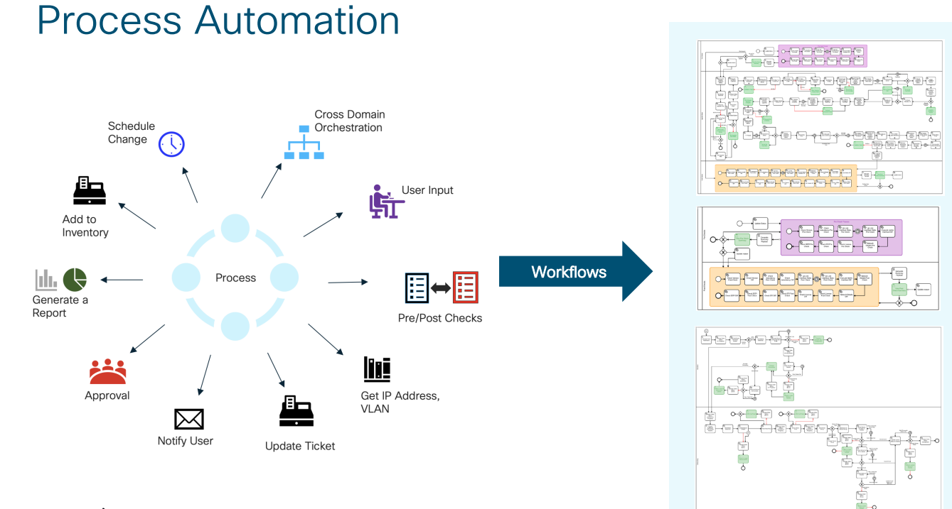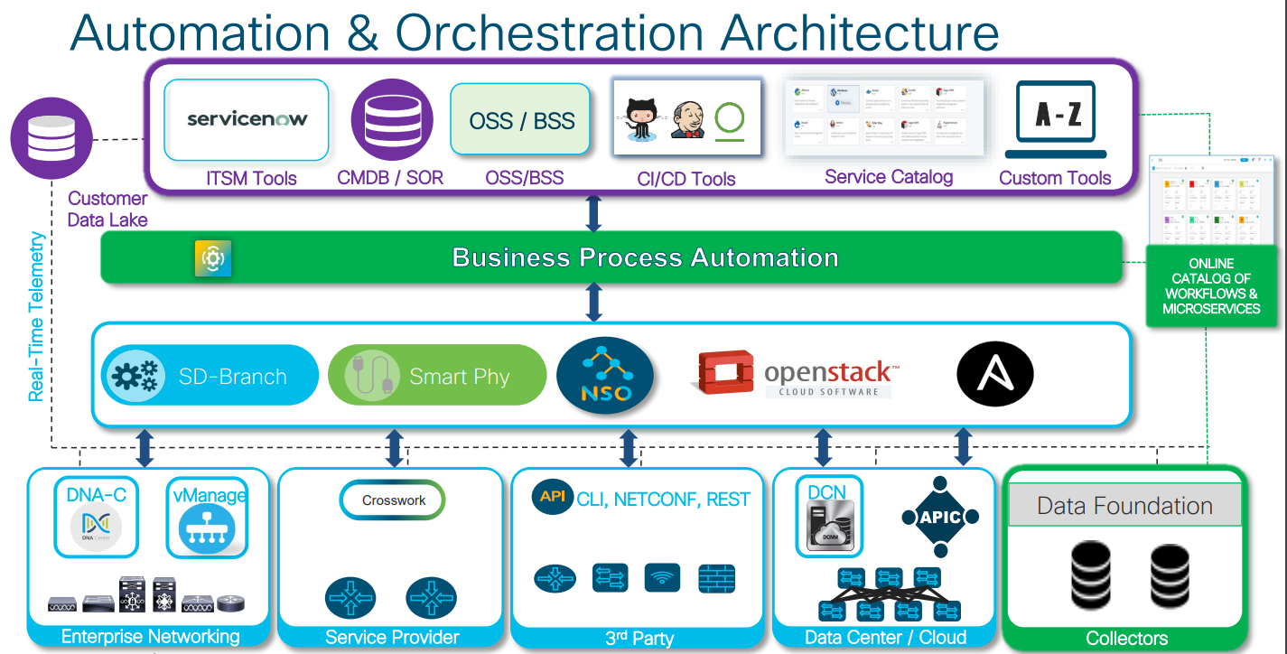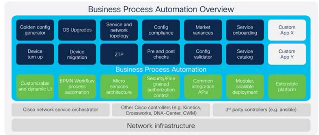 The first solution is Cisco’s Business Process Automation. This is a scalable, microservices based platform that is vendor AND controller agnostic. It is pre-integrated with Cisco NSO and Ansible and is capable of working with other Cisco and third party orchestrators. It provides the ability to automate and monitor operating system automation and configuration compliance with golden images.