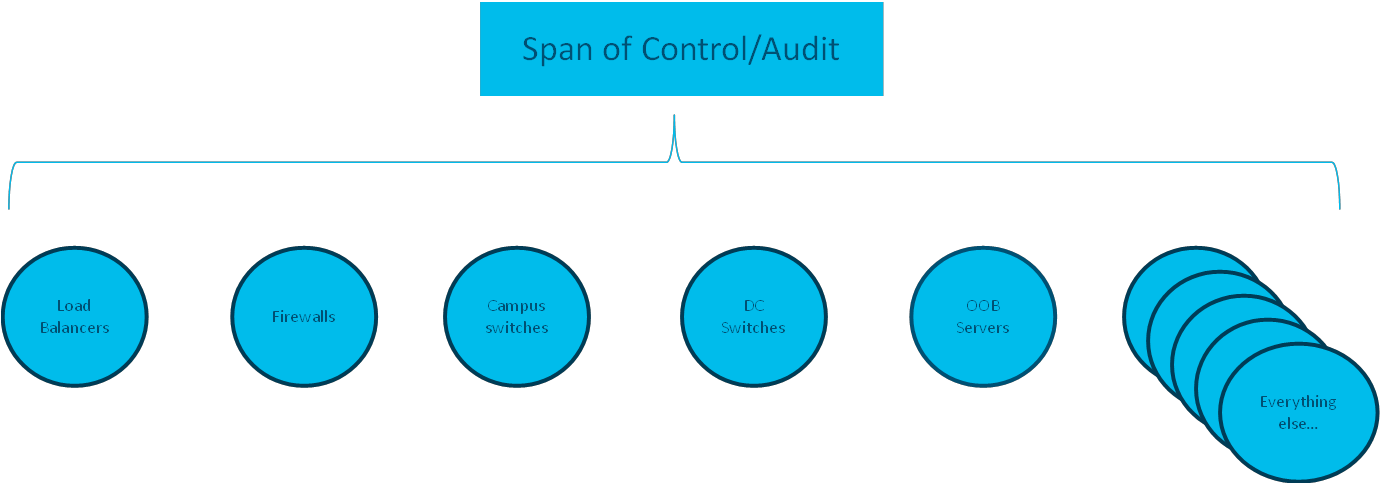 The benefit of this approach is you can abstract the entirety of the span of control and work on provisioning consistent services securely. It provides an API which can allow for easy auditing of the entire breadth of the environment, from the physical to the virtual, including third parties. It supports multiple workflows to be able to manage a compliant infrastructure, from device onboarding with ztp, handling asset management, and ensuring golden software and configurations are applied and compliant.