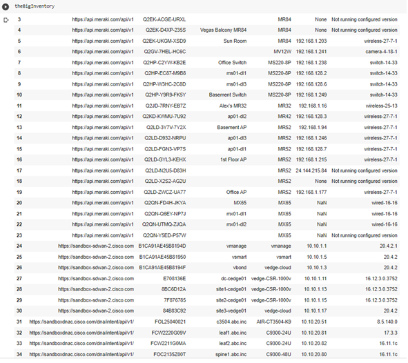 InventoryNotInSvcnow_df=theBigInventory.merge(svcnow_inventory_df, how = ‘outer’ ,indicator=True,left_on=[“Hostname”,”IP Address”,”Model”,”Version”], right_on=[“name”,”ip_address”,”model_number”,”firmware_version”]).loc[lambda x : x[‘_merge’]==’left_only’]