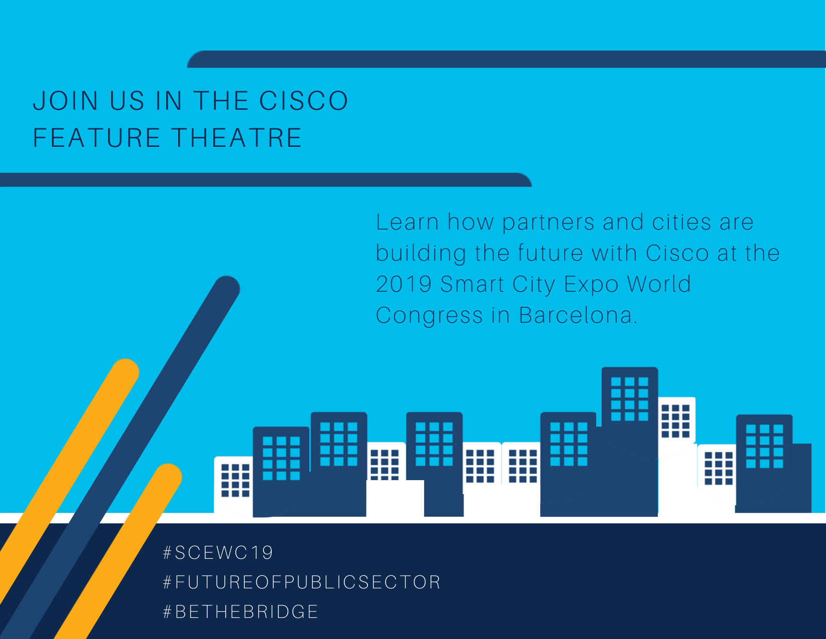Visit Cisco at Smart City Expo World Congress at Stand D461 to take a journey with us on our immersive world tour of digital transformation, featuring stops in the United States, Germany, India, Australia, and more. Join us to see how technology is being leveraged across public sector to keep our countries, communities, schools, and healthcare organizations safe, while improving and changing lives.