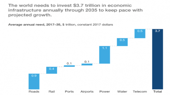 McKinsey Global Institute research found that the current pace of infrastructure investment would be insufficient to support initiatives in cities worldwide over the next two decades. Rather, $3.7 trillion in investments in economic infrastructure is needed every year from now until 2035.