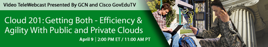 And we’ll use the series as a way to keep you informed of any events related to cloud and government. As an example, you can check out Cisco’s GovEduTV, which provides access to cloud-related town halls. One specific event listed there that you absolutely won’t want to miss is “Cloud 201,” a session on April 9 about getting efficiency and agility with public and private clouds. Click on the banner below for complete details, including registration. This session is the follow-on session to “Cloud 101,” now available on-demand, which was a primer on cloud for government and education professionals.