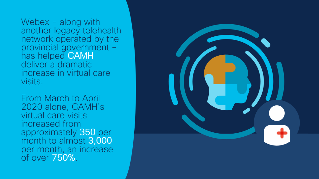 CAMH, headquartered in Toronto, Canada, delivers crucial support to local patients. Since September 2018, a group from Cisco Canada has worked with CAMH to deliver virtual care to patients securely over Webex. The goal was simple: enhance virtual care so that more patients – regardless of location – could access critical mental health services. When the pandemic hit, the foundation was laid, enabling them to quickly maneuver.