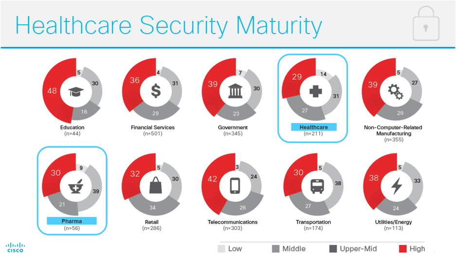 Acknowledging these common challenges, what you may find disconcerting is that most healthcare organizations—including life sciences companies—sit behind the curve in terms of security preparedness or “maturity.” Our just-released Annual Cybersecurity Report specifically calls this out, noting that less than one-third of healthcare organizations have high maturity. This means that most healthcare organizations still treat security as a requirement best relegated to IT, rather than integrating security across organizational culture, processes, and technology.