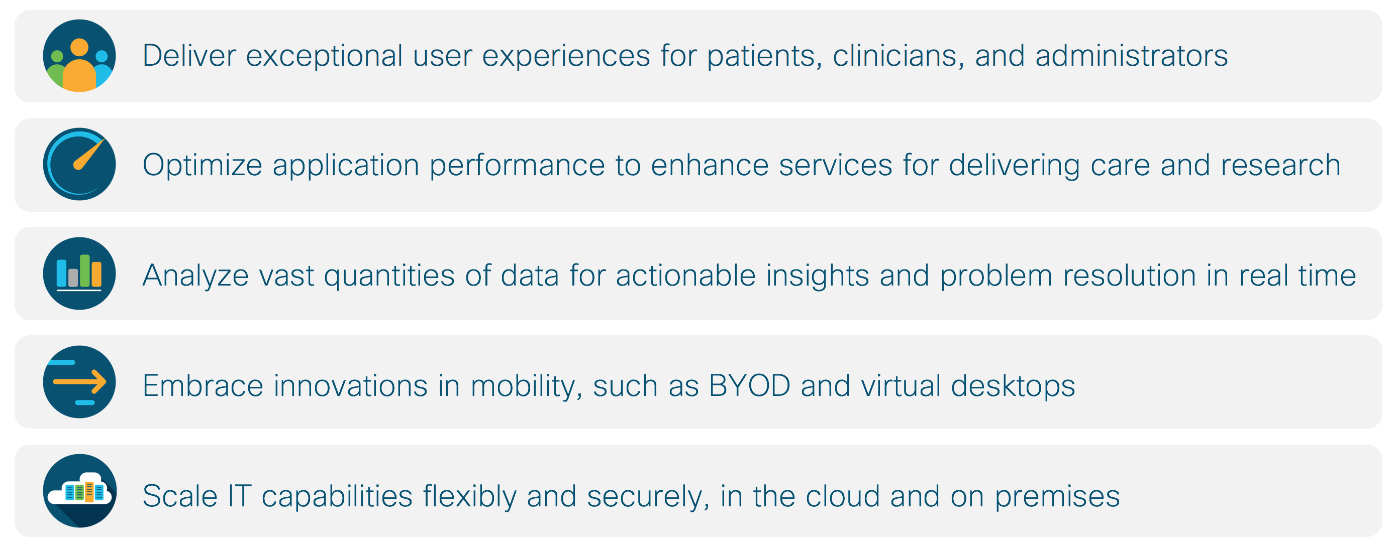 Cisco Data Center solutions make it possible to deploy and run these mission-critical healthcare applications and workloads – quickly, securely, and reliably – even across the multicloud domain. By enabling hybrid IT transformation, you can: