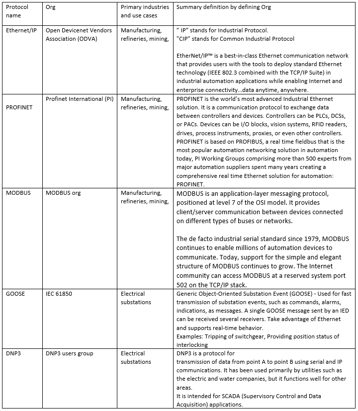 Brief Description of select industrial protocols (with examples)