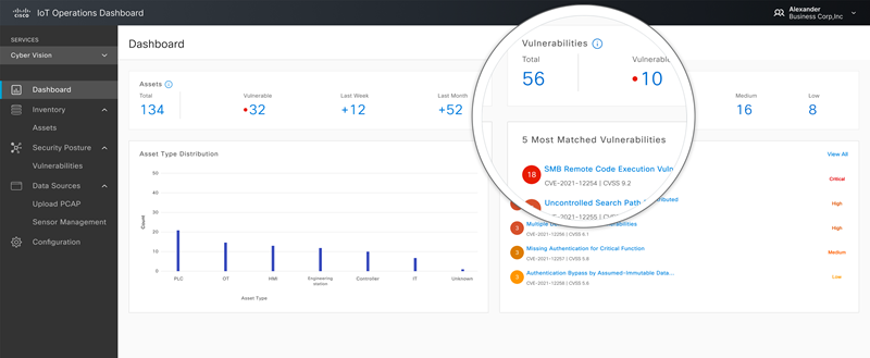 - Deep visibility of connected industrial assets and your security posture: Cisco Cyber Vision is now integrated as a service in IoT Operations Dashboard. Cyber Vision delivers deep visibility into connected assets on the industrial network so that IT and OT teams can implement cybersecurity best practices. Cyber Vision automatically builds a detailed asset inventory and identifies vulnerabilities. It leverages risk scores from Cisco Kenna to then prioritize vulnerabilities for the OT teams to action. It also shares your OT asset inventory with SecureX, Cisco’s XDR platform. Security analysts now have a full inventory of both IT and OT assets to make threat investigations easier and build remediation workflows to secure the industrial environment.