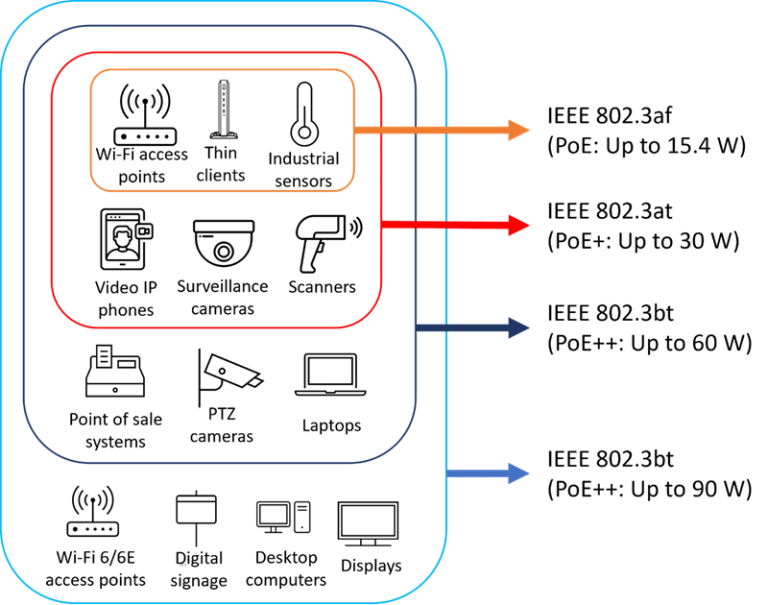 - What are my power requirements? Industrial cameras and access points typically require more power than similar devices designed for enterprise environments. Devices that consume up to 15.4W can connect to PoE (IEEE 802.3af) ports. For up to 30W you’ll want PoE+ (802.3at). And for 60W or 90W—for LiDAR equipment, digital displays, smart lighting, or even computing devices on factory floors, for instance—look for a switch that supports PoE++, also called 4PPoE (802.3bt). Be aware that higher temperatures can reduce power delivery capacity, so factor that into your power budget. For a large PoE power budget consider the Cisco Catalyst IE9300 Rugged Series. Models in this series can deliver up to 720 watts of PoE from a single rack unit switch and can power up to 24 devices at the same time.