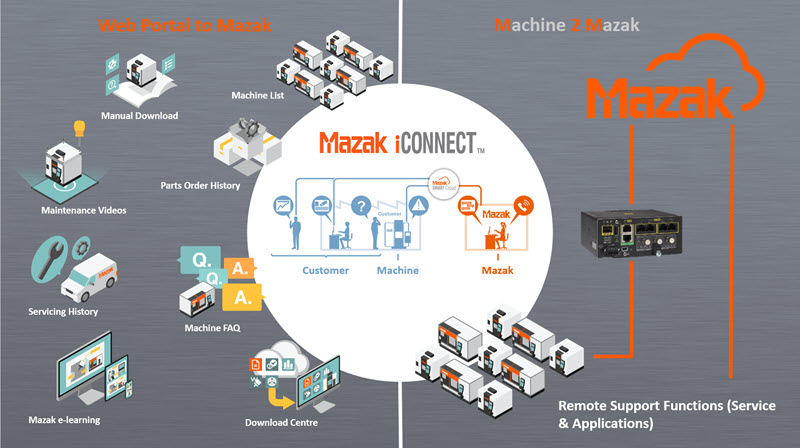 Mazak iConnect is a comprehensive service that connects customers, machine tools, and Mazak’s support center with cloud network technology. It provides various support services such as remote diagnosis of equipment.
