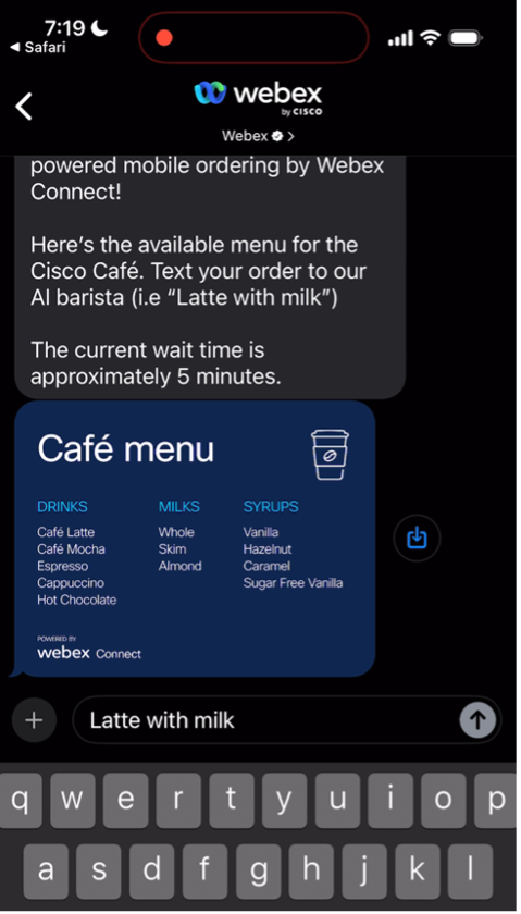 AI was on full display inside Cisco’s booth as our mobile engagement demo highlighted Webex Connect’s ability to redefine the purchase journey with intelligent automation. Mobile coffee ordering met attendees in the Cisco booth, highlighting an experience beginning with AI-driven self-service and finishing with some of the best lattes on the show floor.