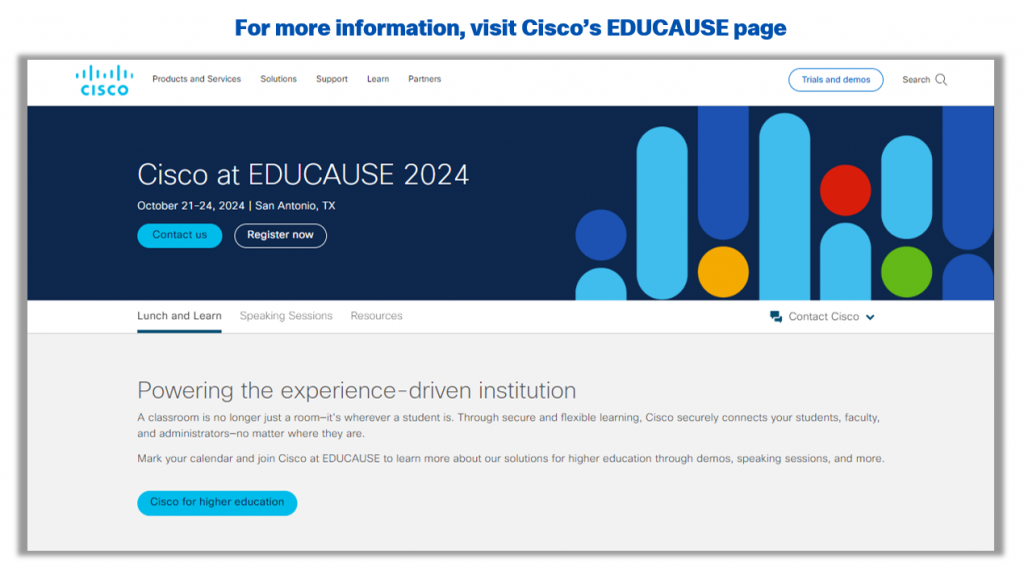 Cisco is excited to participate in EDUCAUSE 2024 for another year, the premier event for IT professionals and educators in higher education. We’ll be onsite sharing our innovative solutions, which are designed to transform the educational landscape and ensure institutions are equipped to meet and exceed the ever-evolving needs of students and faculty.