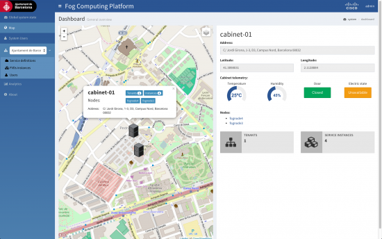 This paradigm shift is well aligned with the vision and smart city initiatives driven by the Barcelona City Council. As a result, Cisco, together with the City of Barcelona and several partners, is conducting a proof of concept (PoC) on fog computing that aims to realize this vision at scale. Started in April of this year, the PoC focuses on the development and validation of a multi-vendor software platform. It is the outcome of the co-innovation efforts by the Barcelona City Council, three startups companies (Sensefields, PrismTech and PLAT.ONE), a technology partner (Schneider Electric), academia (Barcelona Supercomputing Center, Technical University of Catalonia and i2cat), and several teams within Cisco.
