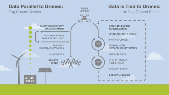 Fog-enabled drones create endless possibilities for commercial use. My colleague Chuck Byers offers a great example in his recent drone delivery use case blog for Open Fog Consortium. But the commercial use of drones plus fog computing doesn’t stop when pizza and beer arrive at your home on a Friday night. Drones are key to many even more disruptive services. Some of Chuck’s examples include:
