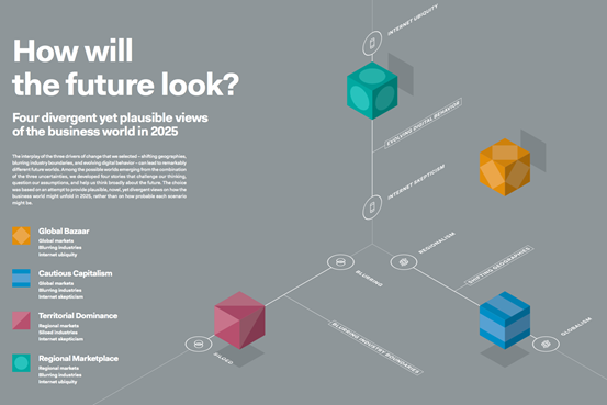 The report presents four business scenarios for 2025. Each scenario is a plausible, challenging, and rigorously constructed story. We’ve built the scenarios on external driving forces—forces that individual organizations have little or no control over.