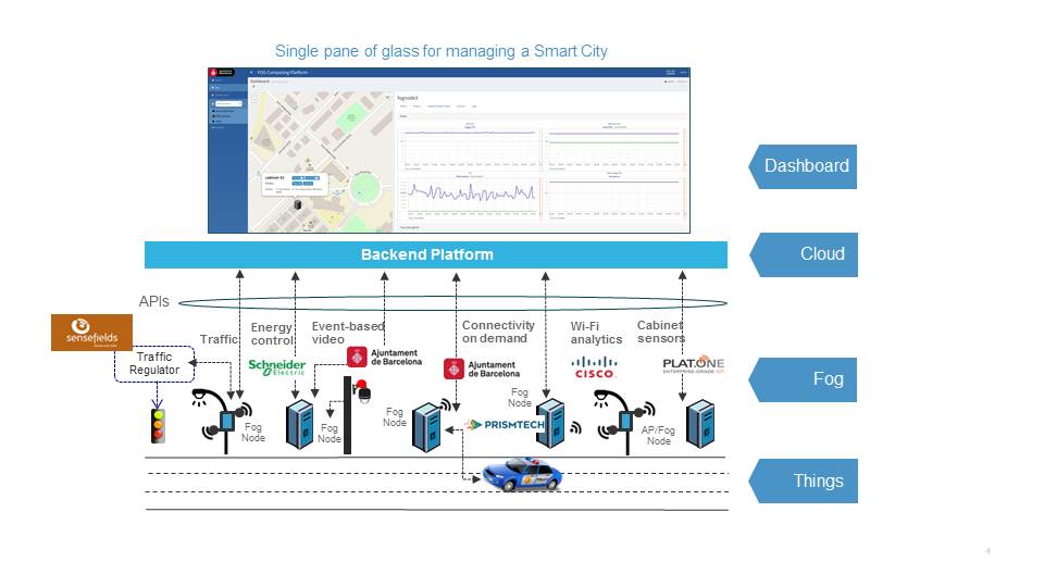 Exciting possibilities of a fog approach are coming to life in Barcelona, Spain. Last week, I participated in a live demo of a proof of concept project that brings together a number of disparate smart city services within a single unified architecture, rather than in disconnected, siloed efforts. Barcelona has been working for several years to develop “smart” urban services, including lighting, traffic management, event-based video, and on-demand connectivity. For the most part, however, these services have been developed and deployed independently by different city departments—resulting in a dazzling array of sensors, gateways, repeaters, and other devices positioned on poles, posts, and walls around the city. The proof of concept project consolidates and integrates these separate systems in secure, strategically placed outdoor cabinets, and provides a single-screen view to monitor and manage data, applications, virtual switches and routers, fog nodes, fog services, and the network. This project represents a paradigm shift for smart city services, leveraging both cloud and fog capabilities to integrate a rich set of use cases on a multi-vendor software platform.