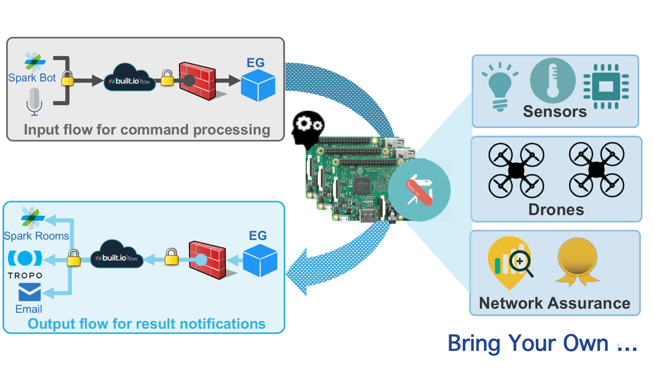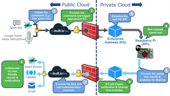 Cisco’s Karan Sheth collaborated with Built.io’s Nishant Patel and team to create a collection of enterprise-class, speech-controlled bots. As described in the diagram above, a user’s arbitrary speech or Spark commands were delivered to Cisco’s private cloud environment over Built.io’s cloud and secure enterprise gateway infrastructure. Once inside the secure infrastructure, even the smallest of hardware like Raspberry Pi could execute intended workflow commands without worrying about security or access control.