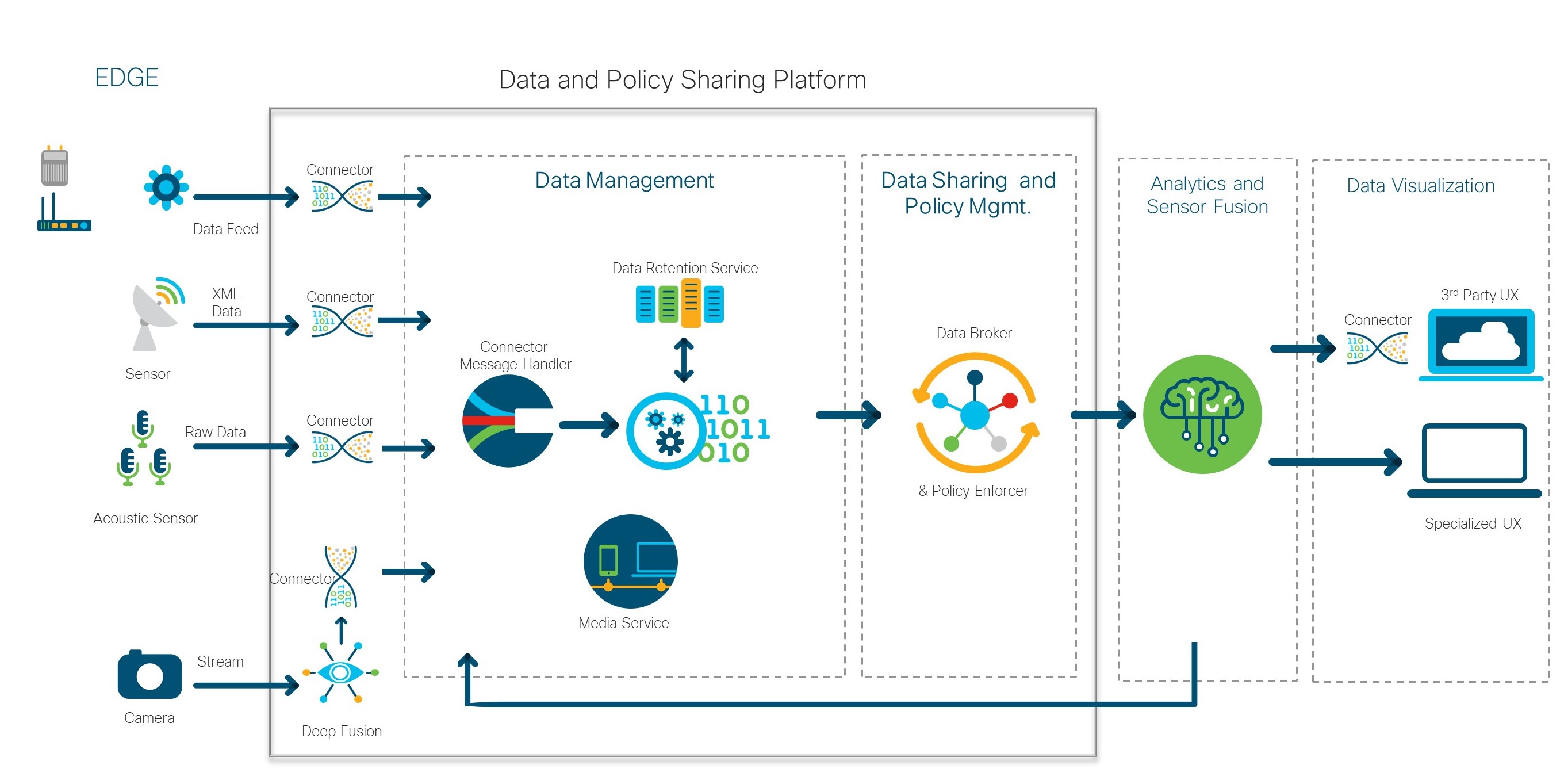 - Analytics and Sensors Fusion – The system securely brings diverse data sources, and fusing two or more of them allows the creation of insight that could not be otherwise obtained. It also creates new signals that have high-discriminating power, which can be made available as a new data source to consumers or used for further fusing. One of the technologies used in this layer is AI’s Deep Fusion, advanced video analytics and training leveraging deep learning, and with the ability to identify humans, animals, and vehicles in a video stream. This fusing further enables the contextualization of events.
