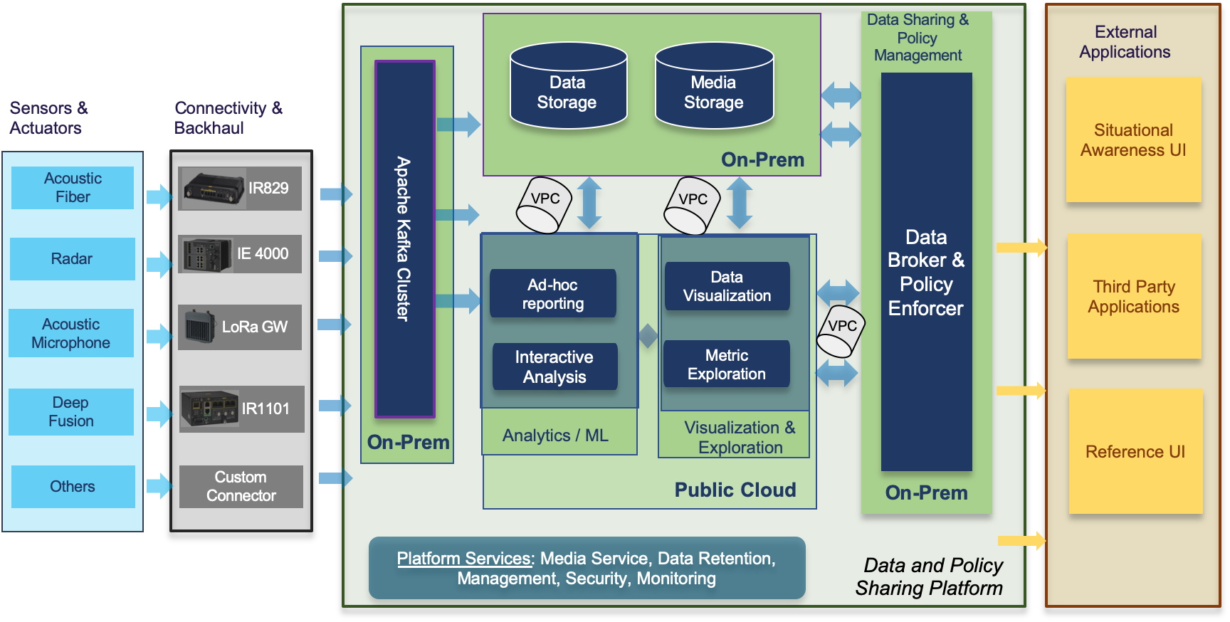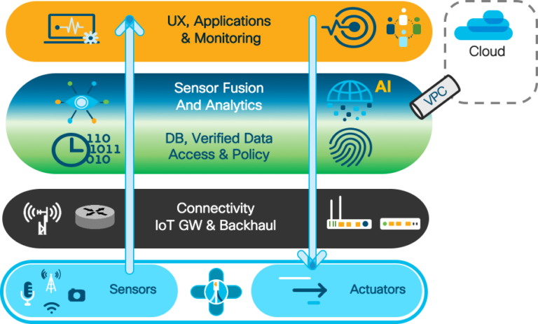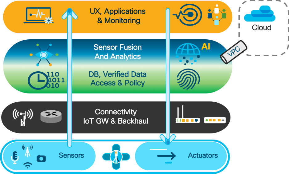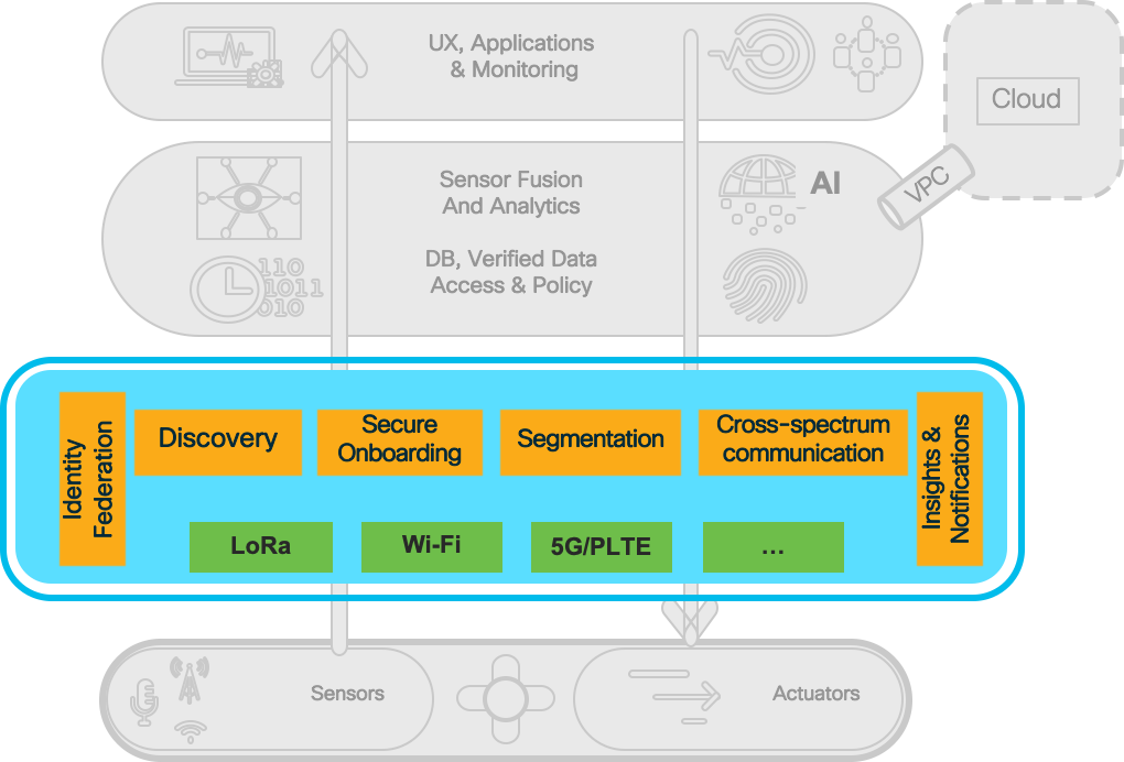 - Verified Data Access, Exchange and Policy – The data generated by the sensors and other sources is the fuel of the whole architecture. This data requires robust and sophisticated access and sharing policy management, given its sensitivity and privacy. Verification and assurance of the data as well as strict policy-based control for where and how to share it, and space-temporal context for access is paramount.