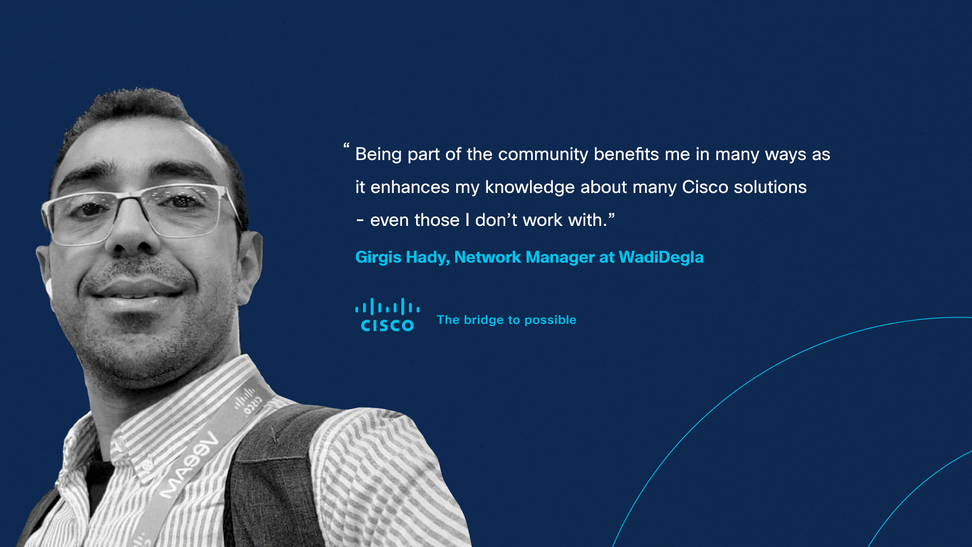 Cisco’s advocacy community, Cisco Insider Advocates, brings our customers together and provides a way for them to make powerful connections, expand their professional and personal networks, and learn from top experts in their field. One of our goals with our advocacy community is to deepen our relationships with our customers and today, we have one of the friendliest faces in the community joining us for a chat. I’m excited to welcome Girgis Hady from Wadi Degla Holding. I’d also like to take a moment to shout-out Michelle Zhu who helped with our interview! Michelle was an intern with Cisco’s Global Advocacy team in the summer of 2022, and she partnered with me in interviewing Girgis.