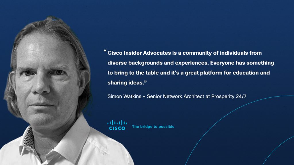 Cisco’s advocacy community, Cisco Insider Advocates, brings our customers together and provides a way for them to make powerful connections, expand their professional and personal networks, and learn from top experts in their field. One of our goals with our advocacy community is to deepen our relationships with our customers and today, we have one of the friendliest faces in the community joining us for a chat. I’m excited to welcome Simon Watkins from Prosperity 24/7.