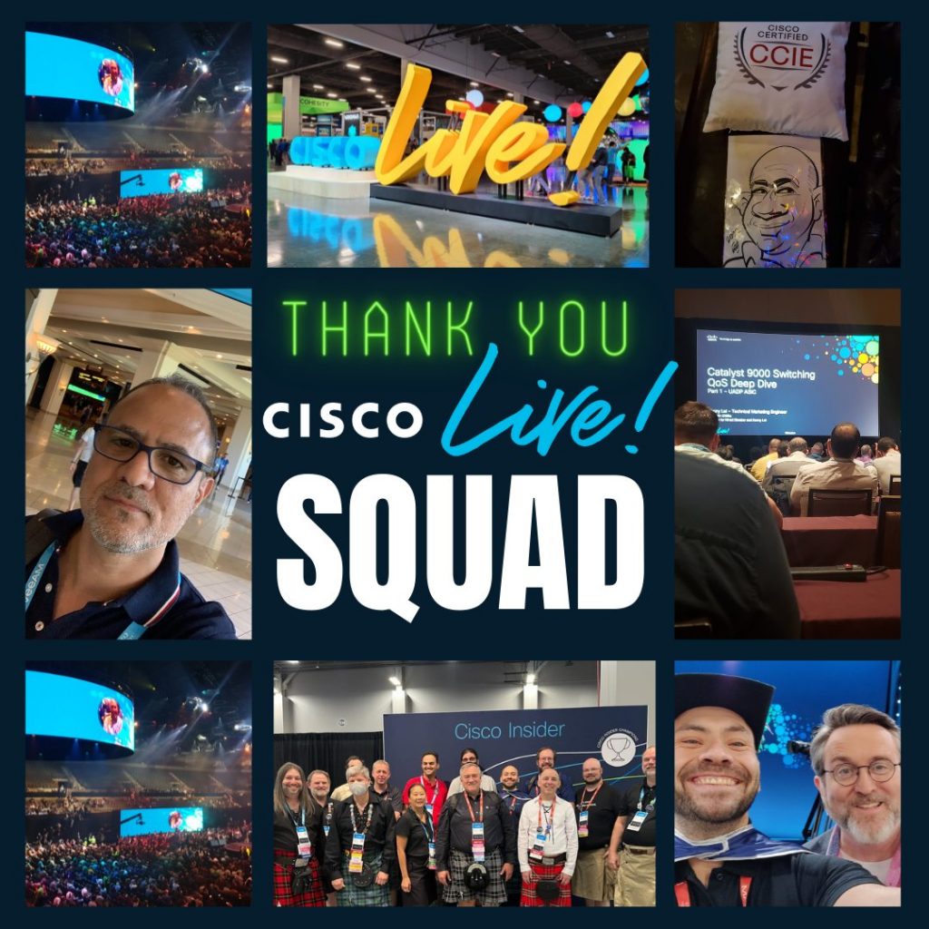 I’d also especially like to thank our Cisco Live squad: Aref Alsouqi, Billy Zoellers, David Peñaloza, Elliot Dierksen, Jonatan Jonasson, Jason Mallon, and Yasser Auda, for bringing Cisco Live alive for the global #CiscoCert community!