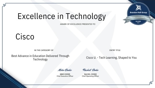 That’s why I was so excited to learn that Cisco U. had won a Silver Award for Best Advance in Education through Technology at the recent Brandon Hall Group’s Technology Excellence Awards. The Excellence Awards recognize the best organizations that have successfully deployed programs, strategies, modalities, processes, systems, and tools that have achieved measurable results. The awards attract entrants from leading corporations around the world, as well as mid-market and smaller firms.