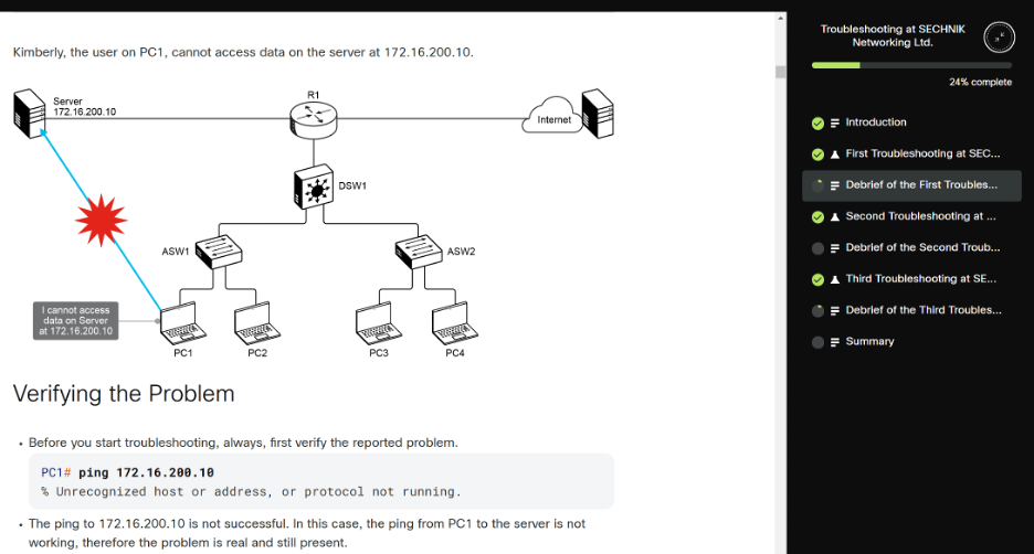The labs for ENTSH are entirely virtualized and spin up within three minutes, allowing you to quickly get started with your learning. Each lab includes a debrief that analyzes and explains the trouble tickets. These debriefs help you understand how to best resolve the issues users report.