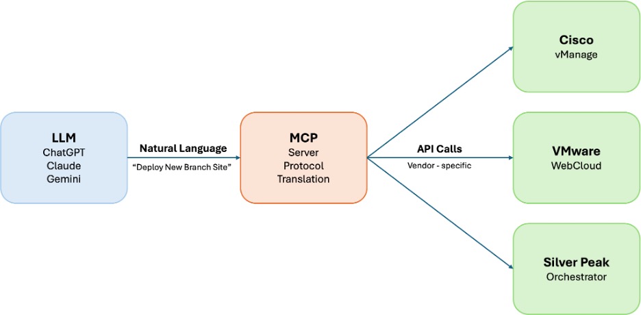 Here’s where Model Context Protocol (MCP) comes in, offering a unified interface that allows AI to interact seamlessly with any network infrastructure using only one method. This interface eliminates the need to learn distinct API syntaxes for platforms like Cisco vManage, VMware VeloCloud, or Silver Peak, enabling natural language commands instead.