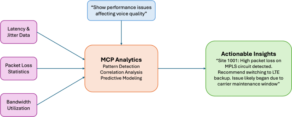 You can create tons of telemetry data with SD-WAN platforms. But if you want to gain usable knowledge, you could be making convoluted commands on several dashboards. With MCP, you just use everyday words in your requests, and MCP can provide data across diverse metrics and timeframes.