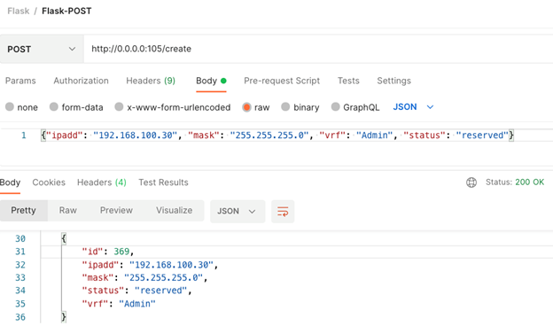 /create route is used to insert a new record in your makeshift IPAM application. It accepts POST method, captures the request body and inserts data into the TinyDB