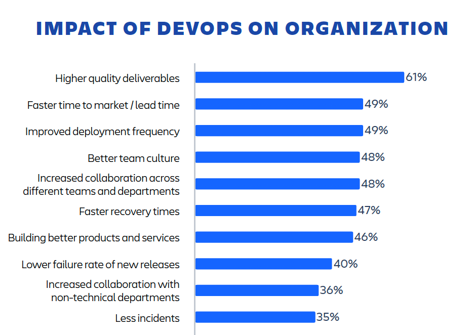 Extensive research by Atlassian showed that once DevOps impacted their organization, 78% of the total respondents had to learn a new skill, 61% say it helped them produce higher quality deliverables and 49% say they see a faster time to market.