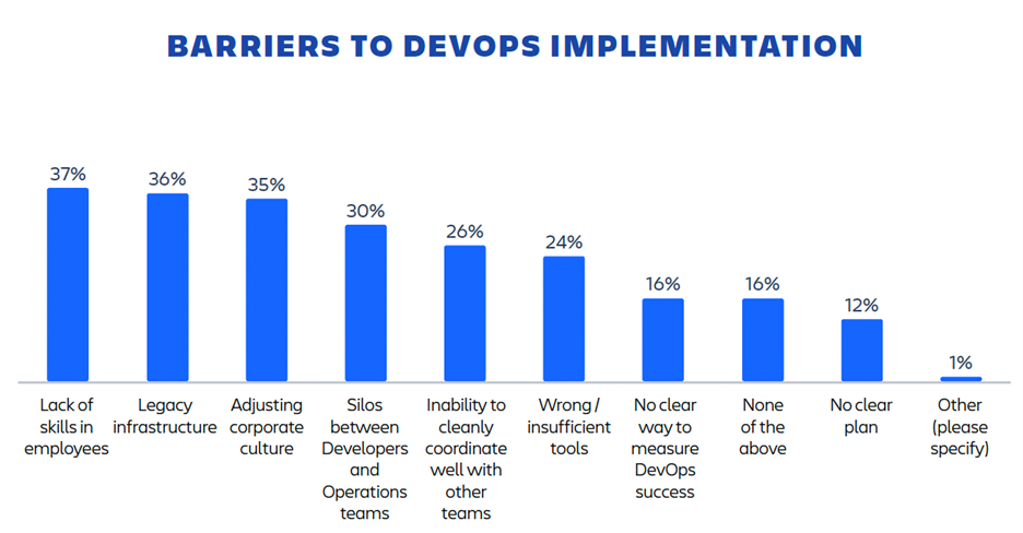 Atlassian’s trend survey showed 84% of respondents have faced barriers to their DevOps implementation. As illustrated in Figure 3, the most common hurdles are a lack of skills in employees, legacy infrastructure and adjusting corporate culture.