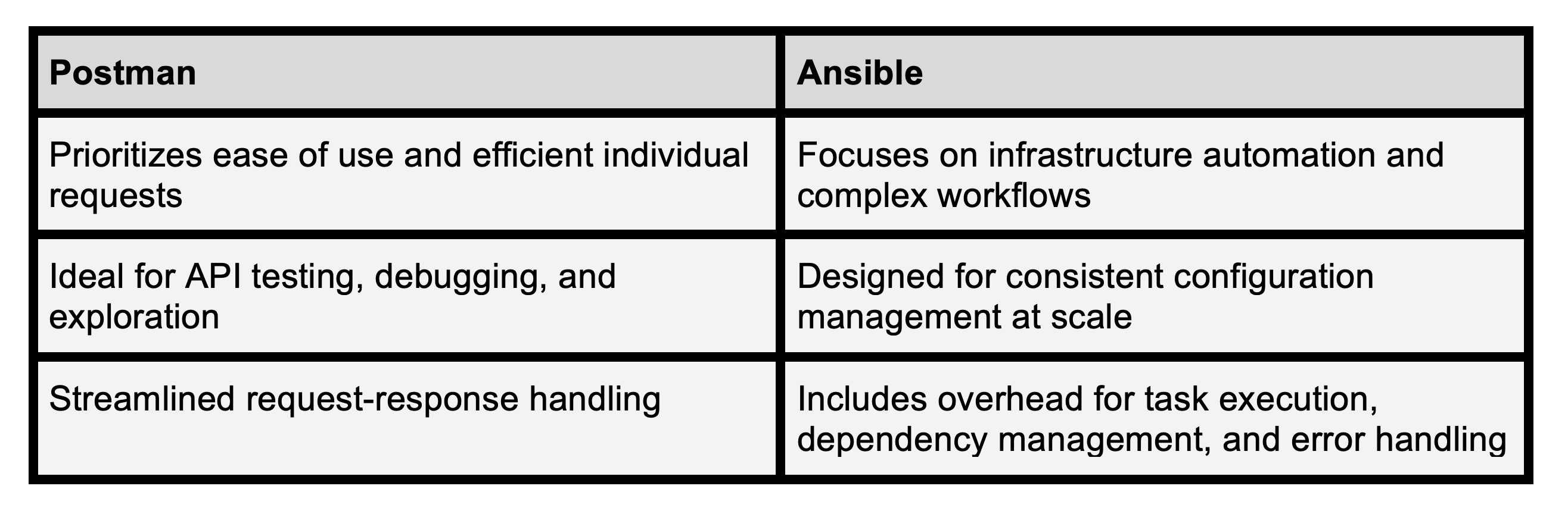 - Overhead: Ansible includes additional layers for task execution, dependency management, and error handling. These features add essential automation capabilities but can introduce some overhead compared to Postman’s streamlined request-response handling.