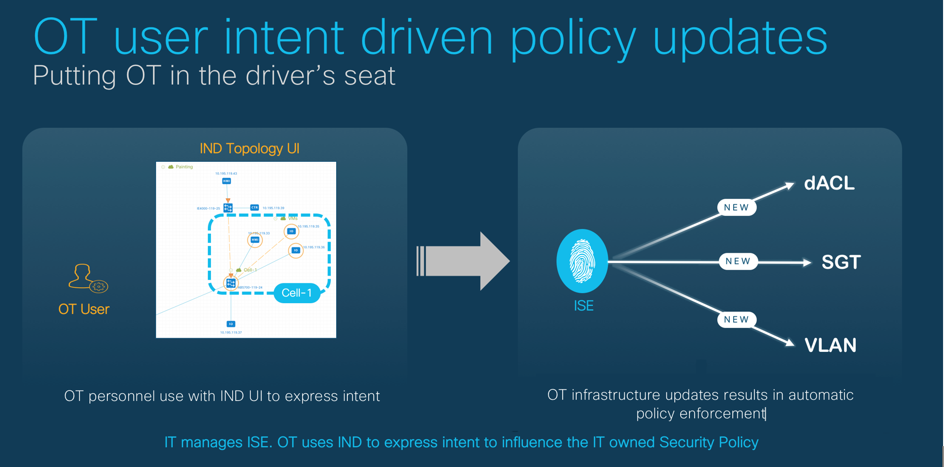 Intent – Intent-based networking systems (IBNS) provide a new way to build and operate networks that improve network availability and agility, compared to traditional approaches (Gartner). Maintaining intent effectively requires dynamic security, policy, and data application triggered by OT intent without dependency on IT for day to day operations.